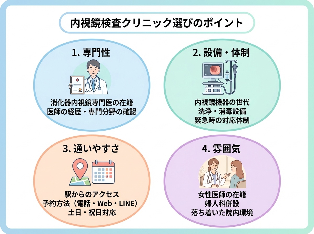 横浜には、内視鏡検査が可能なクリニック・医院・病院が多数あります。ここでは、クリニック選びのポイントをいくつかご紹介します。
