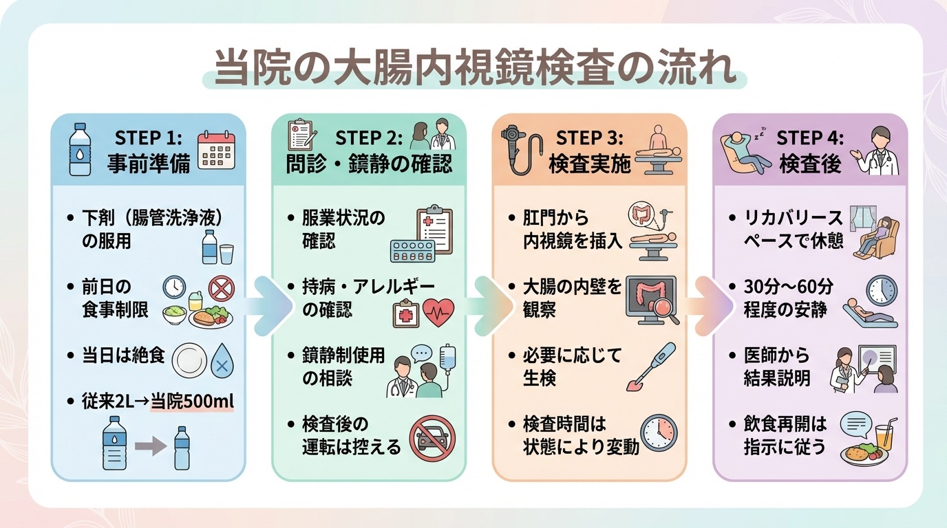 大腸内視鏡検査は、大腸の内側を直接くわしく観察できる一方で、事前に下剤(腸管洗浄液)を飲んで腸の中をきれいにする準備が必要です。