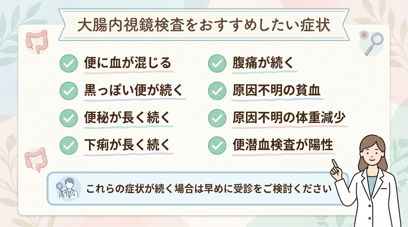 次のような症状が続く場合は、早めに受診し、必要に応じて大腸内視鏡検査を含めた精査を行うことが大切です。