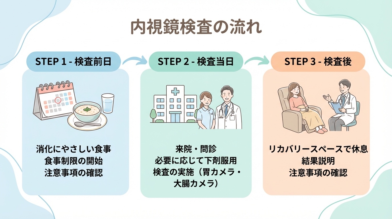 こうした一連の流れを事前にイメージしておくことで、当日も落ち着いて検査に臨むことができます。