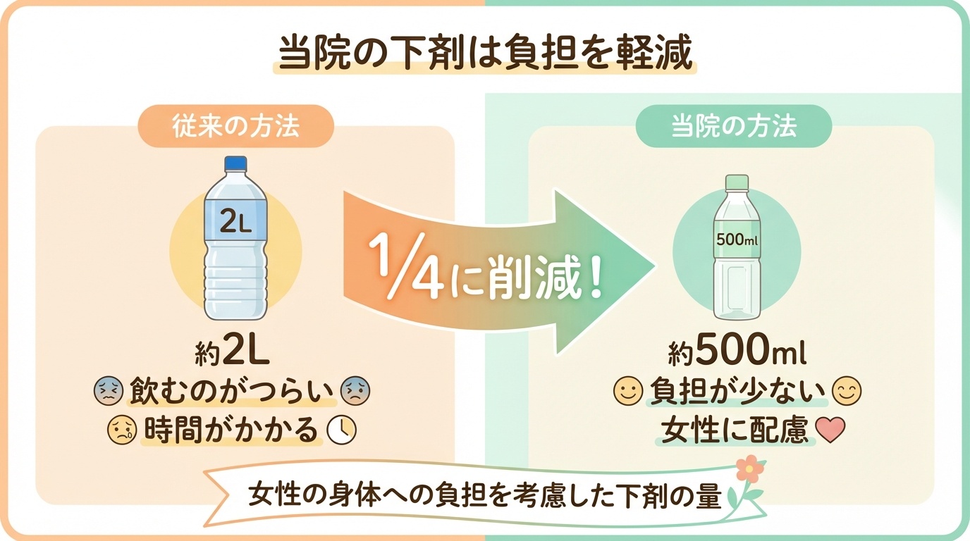 当院では、検査で使用する下剤の量についても、女性の負担をできるだけ軽くすることを重視しています。従来は2L程度の下剤を服用する方法が一般的でしたが、当院は下剤の量を約500mlまで削減しました。下剤の量が少なくて済むことで、「あの大量の下剤を飲むのがつらい」という方でも、より楽に検査を受けていただけるようになっています。