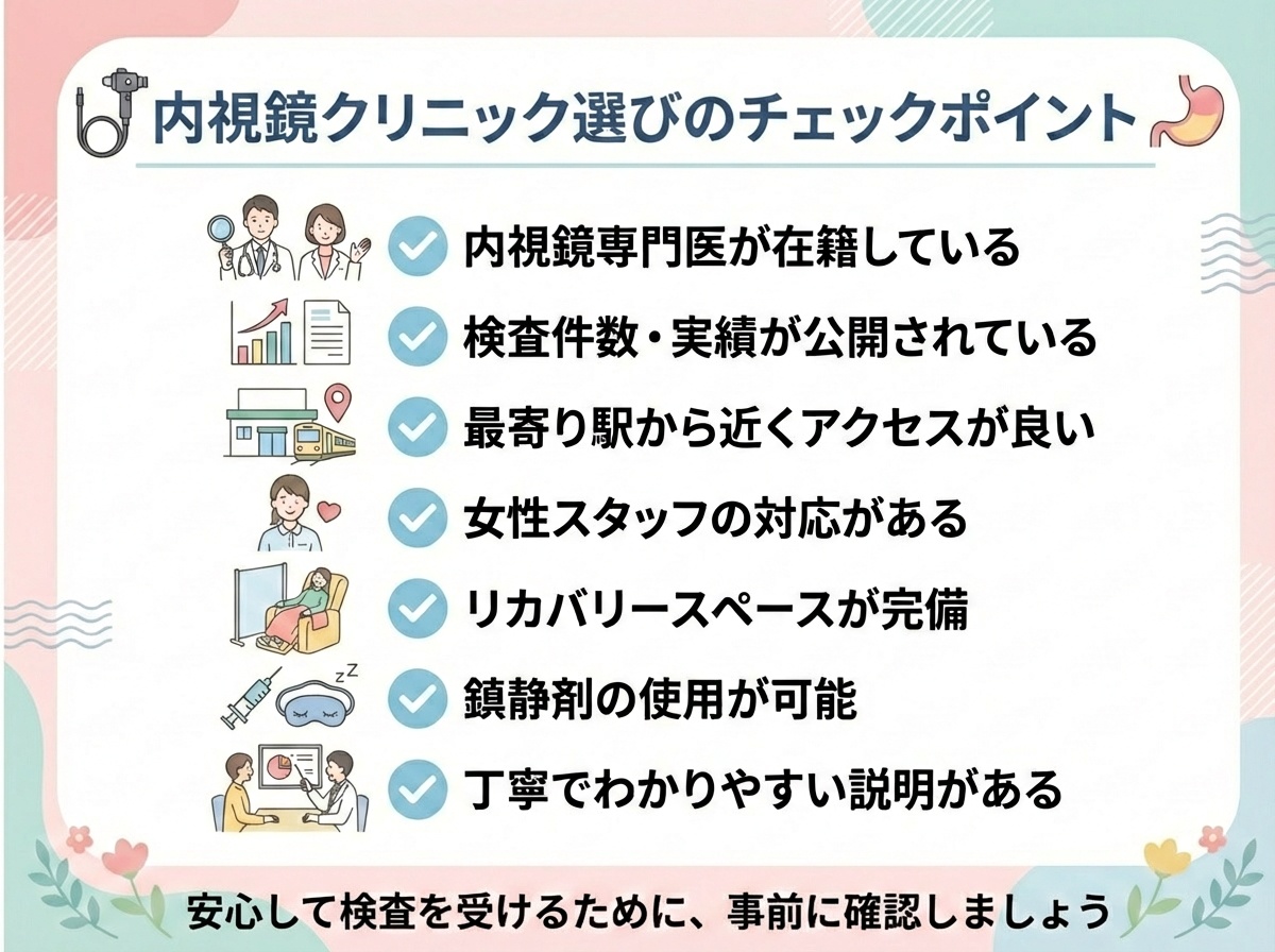 初めての内視鏡検査で不安がある方は、「女性スタッフが対応してくれるか」「更衣室や院内の動線に配慮があるか」といった点を、事前にホームページや電話で確認しておくと、より安心して検査当日を迎えられるでしょう。